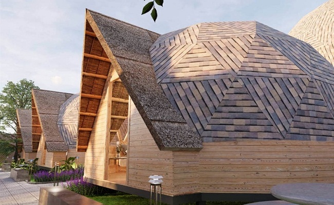 Nhìn tổng thể từ trên cao, căn homestay này có dạng như một con ốc sên nên thường được gọi là nhà bungalow ốc sên. Thiết kế đặc trưng của dạng nhà này là phần mái vòm tròn, được tạo thành từ nhiều mảnh gỗ tam giác. Cũng chính nhờ điểm đặc biệt này mà nhà gỗ ốc sên sở hữu khá nhiều ưu điểm, chẳng hạn như: độc đáo, ấn tượng, độ chắc chắn cao, thích ứng tốt với nhiều kiểu khí hậu,….Cùng với đó là kiến trúc sư thiết kế đòi hỏi phải có chuyên môn cao, chi phí thi công cũng cao hơn so với những mẫu nhà homestay gỗ thông thường.