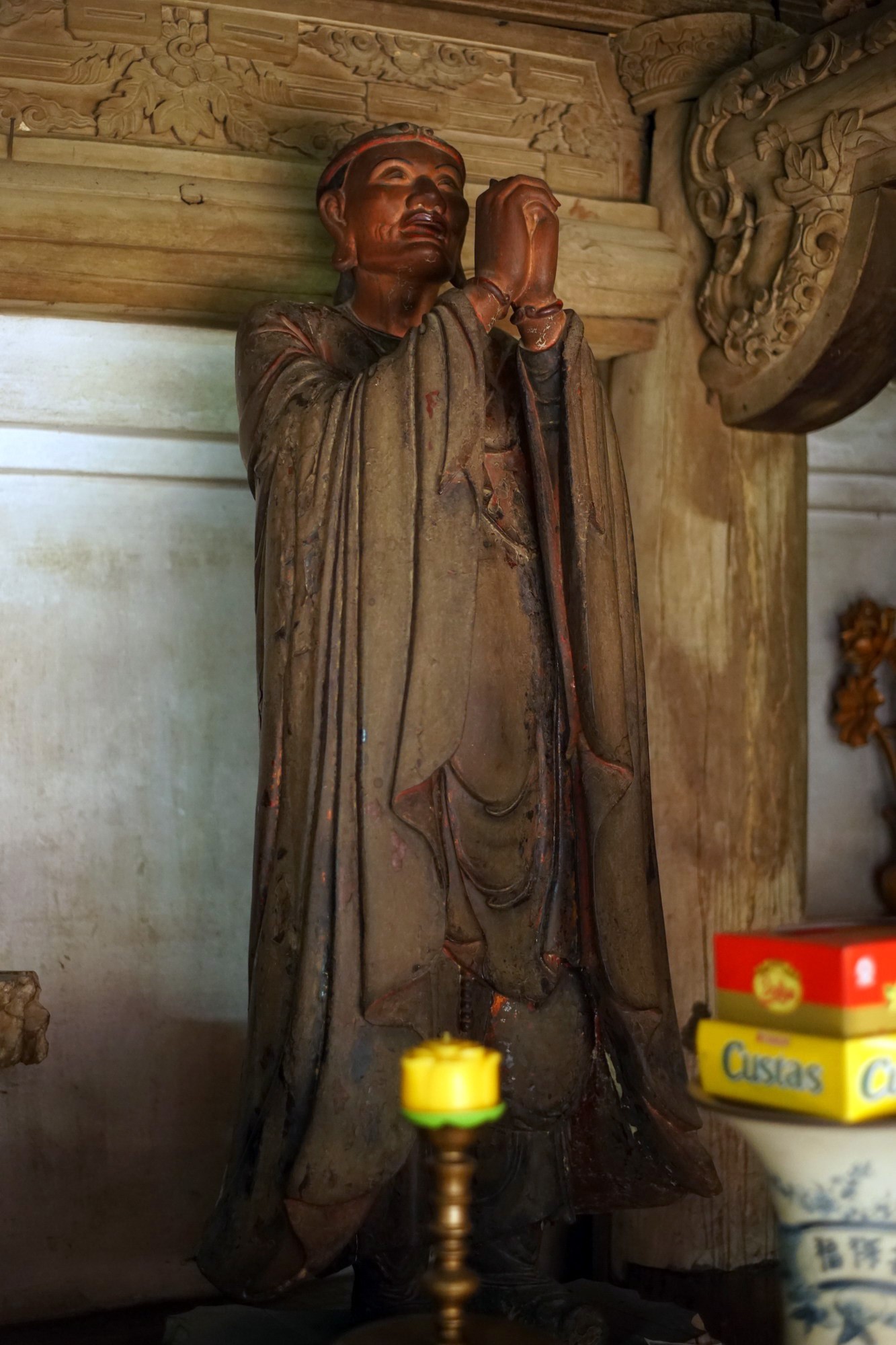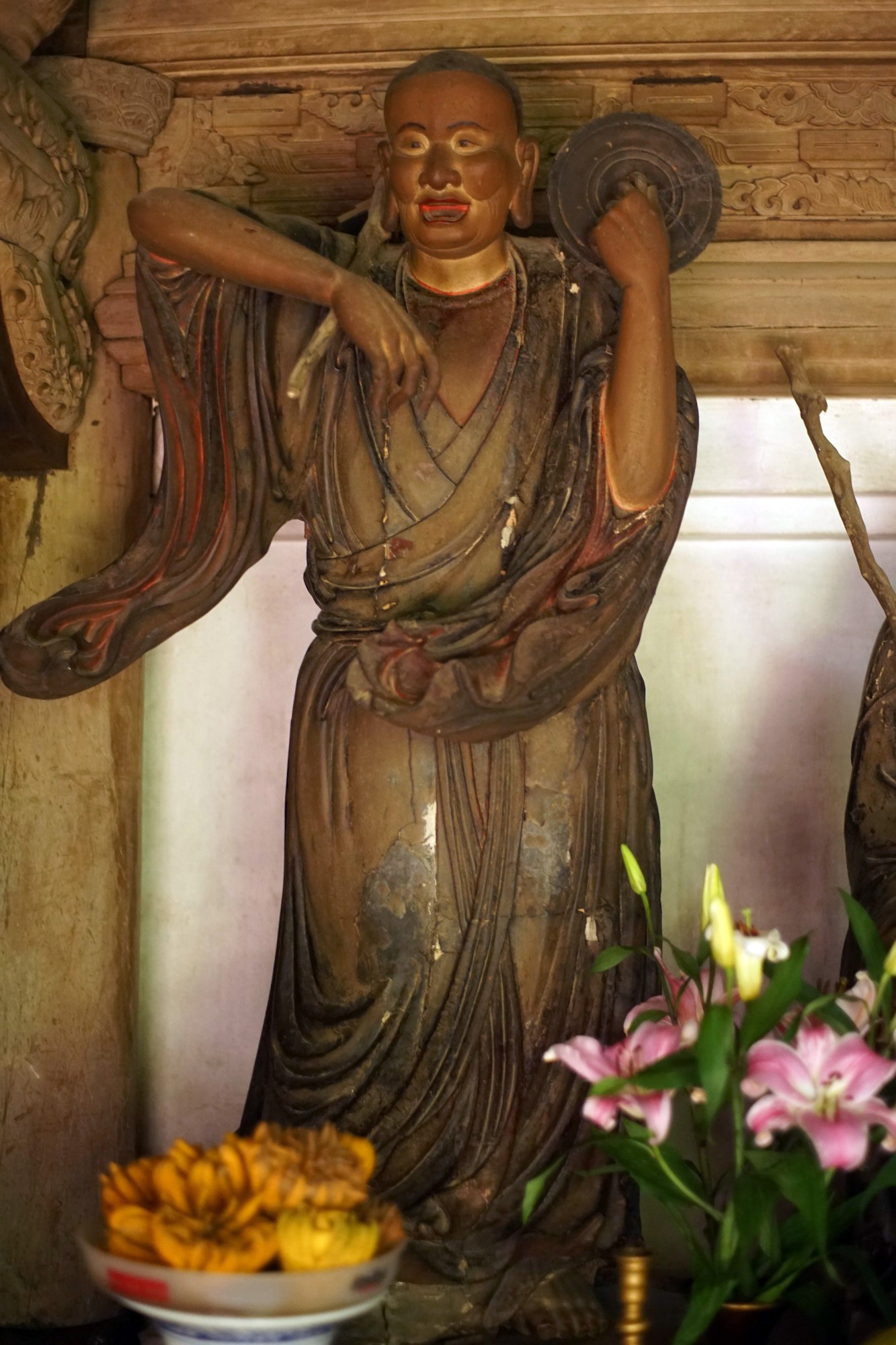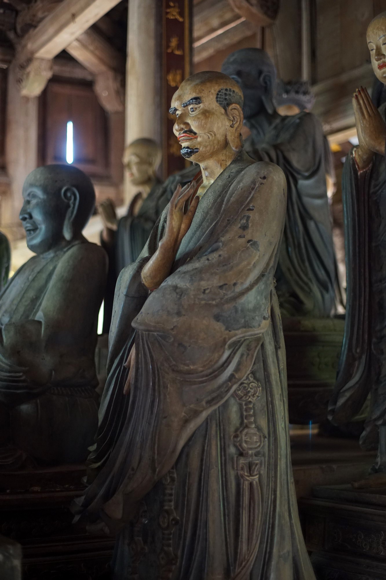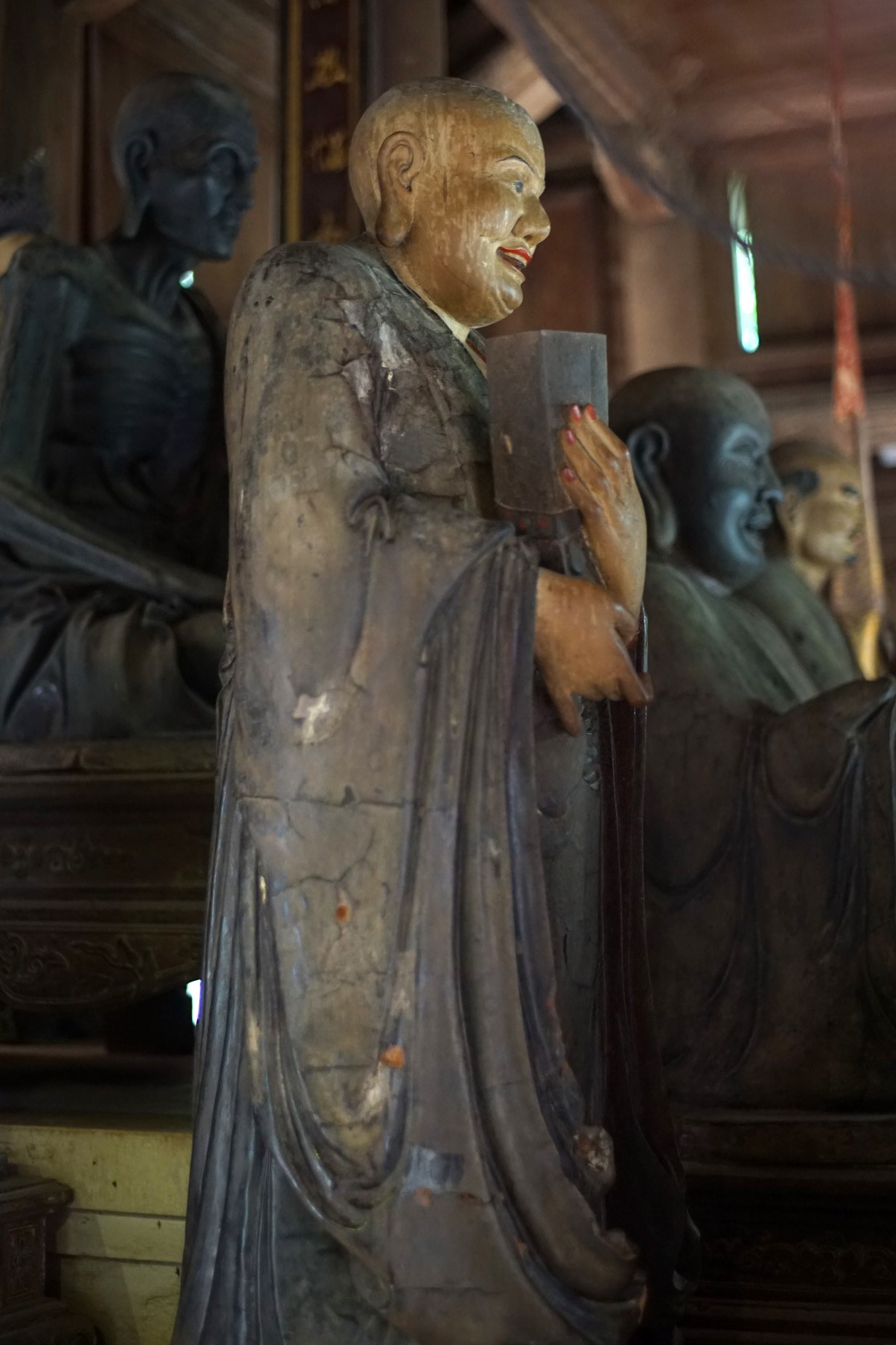 1. Tôn giả Ca Diếp (Mahakasyapa). Theo tích truyện Phật giáo, Tôn giả Ca Diếp là con một gia đình Bà La Môn, song từ bỏ dòng dõi để tu theo Phật. Trước khi xuất gia, ông làm thợ kim hoàn, nên tượng ông có đeo nhiều trang sức.