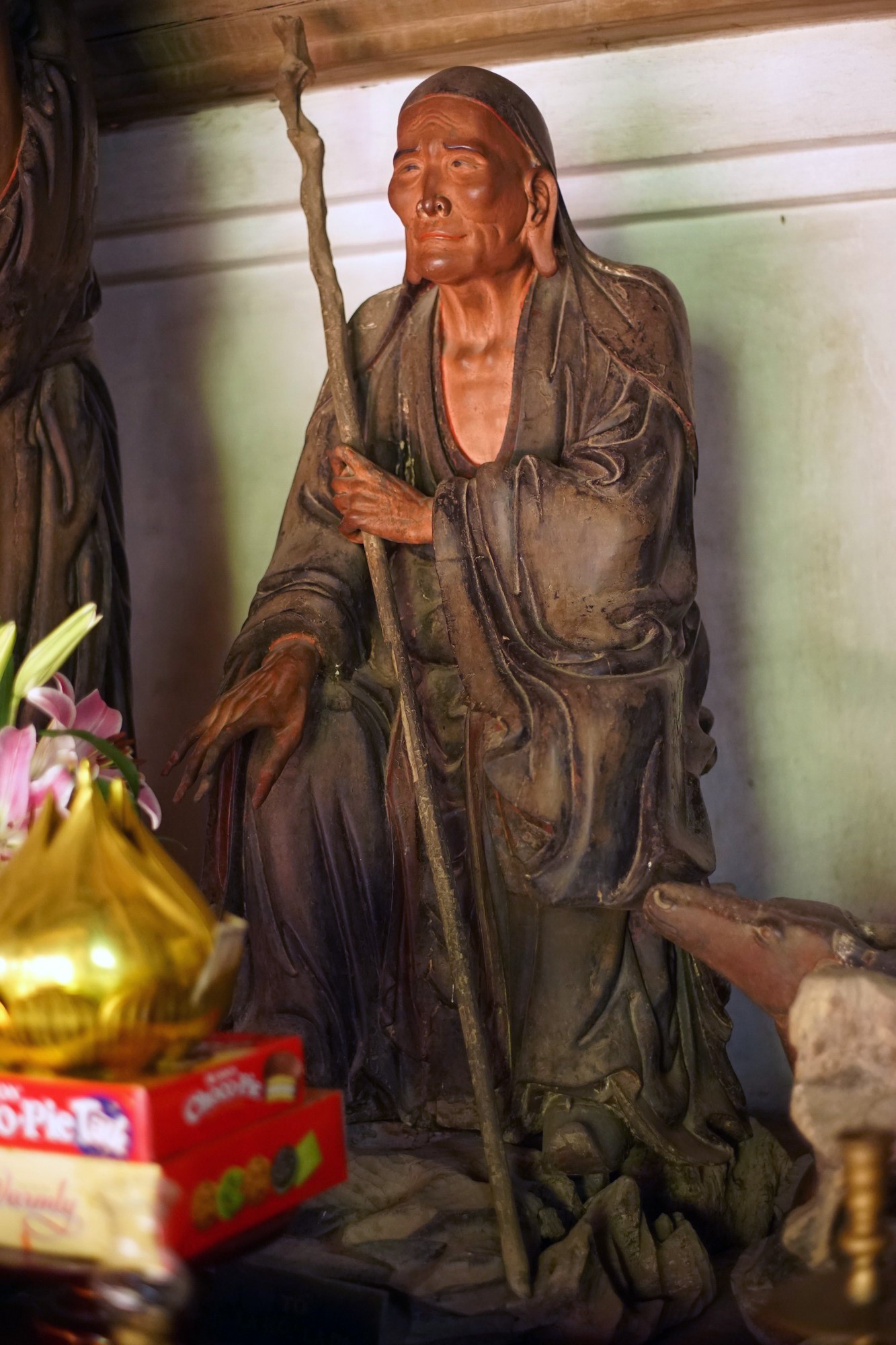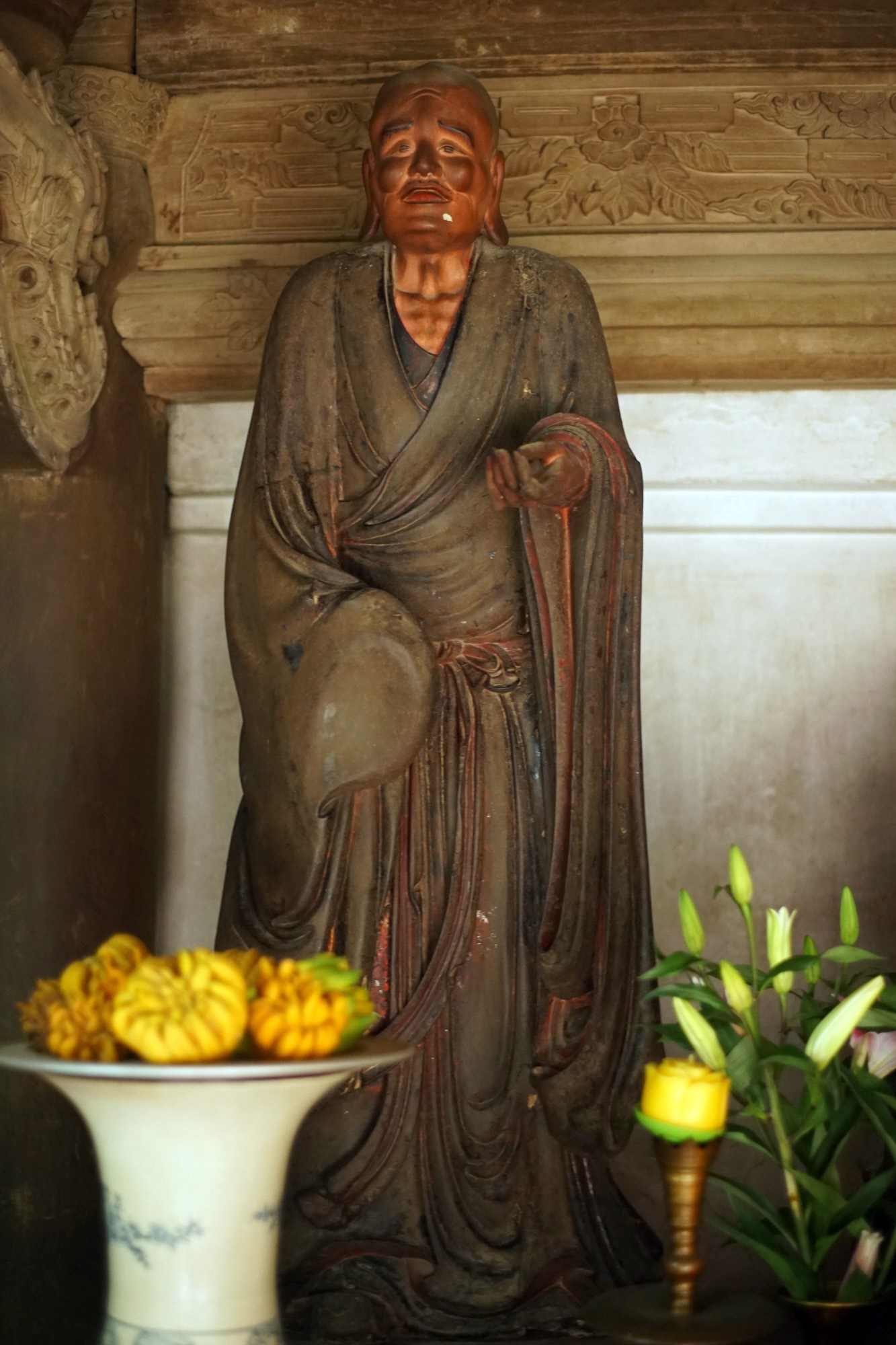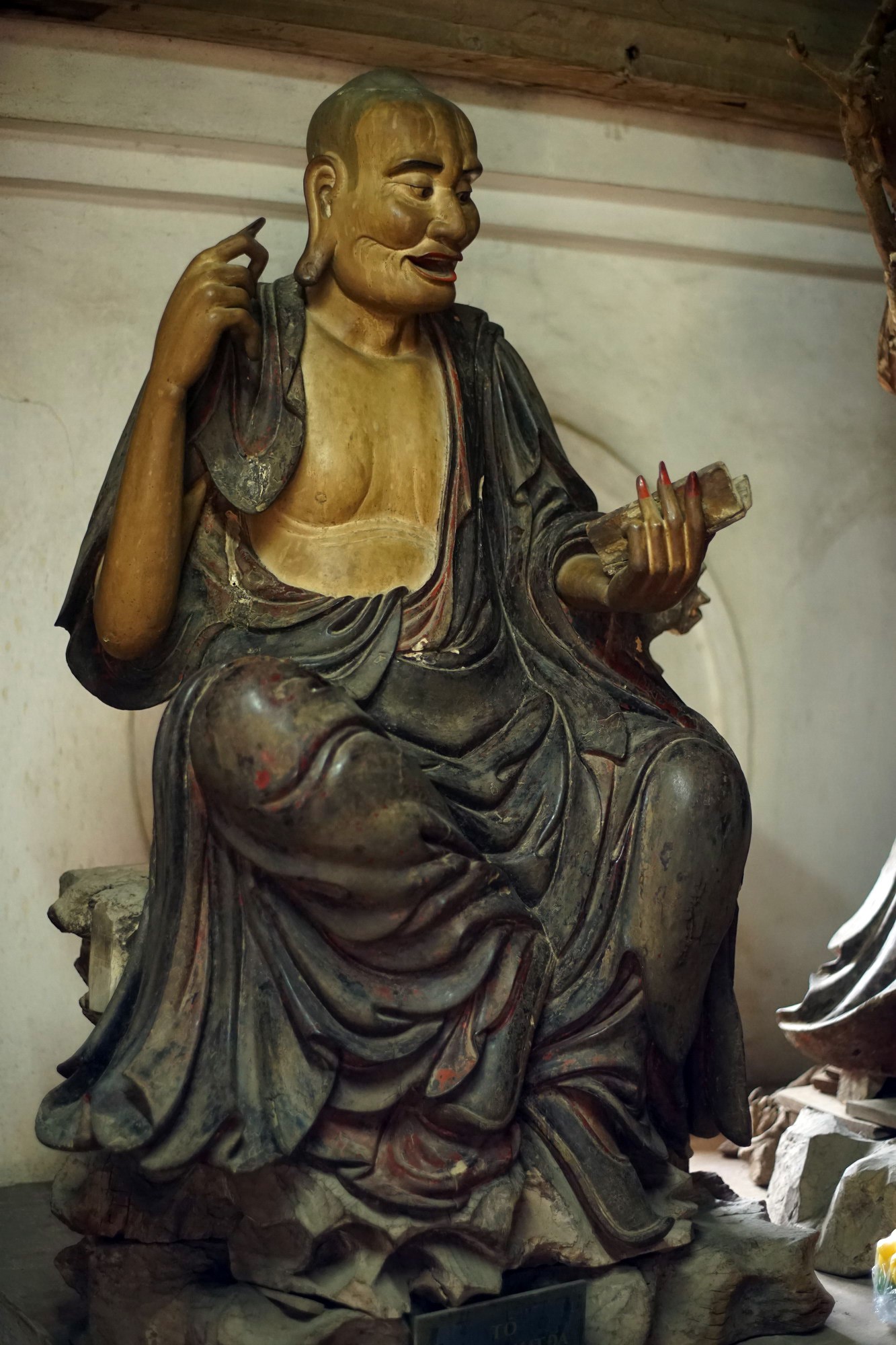 6. Di Giá Ca (Michakha). Sư tổ Di Giá Ca là người đã truyền bá Phật pháp ở rất nhiều vùng đất khác nhau. Tượng ông được tạo hình với thế đứng, khuôn mặt biểu lộ sự ngạc nhiên, như phía trước có cảnh lạ hay đang tranh luận với ai đó. Đây là một trong những bức tượng thể hiện cảm xúc sống động nhất trong các tượng La Hán chùa Tây Phương.